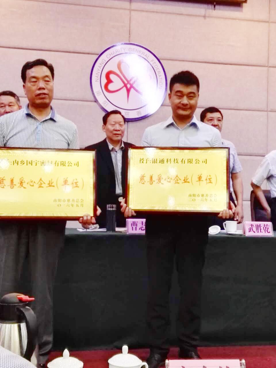 南陽銀通近年來連續(xù)獲得南陽市慈善總會愛心企業(yè),董事長王寶玉先生連年榮獲先進(jìn)個人榮譽(yù)稱號并擔(dān)任慈善總會理事會副會長職務(wù)。南陽銀通自成立以來始終以“誠信、高效”為理念,以“質(zhì)量為本,服務(wù)至上”為宗旨,“慈善和愛心”為義務(wù),努力創(chuàng)造優(yōu)質(zhì)產(chǎn)品,打造良心企業(yè)。
