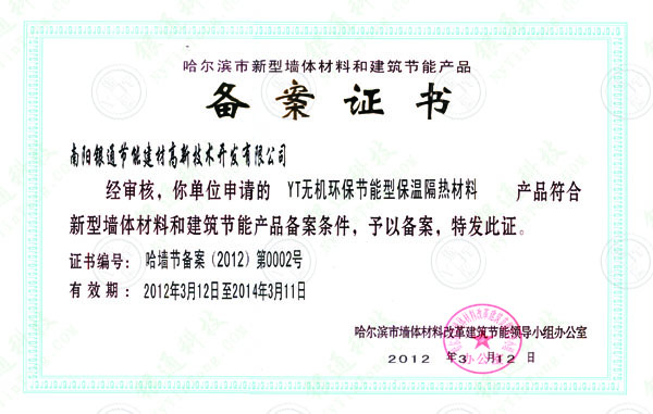 經(jīng)審核,你單位申請(qǐng)的YT無機(jī)環(huán)保節(jié)能型保溫隔熱材料產(chǎn)品符合新型墻體材料和建筑節(jié)能產(chǎn)品備案條件,予以備案,特發(fā)此證。