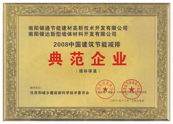 此證書為往年曾獲證書,本介紹頁僅為方便用戶了解企業(yè)歷史資質,望悉知 南陽銀通節(jié)能建材高新技術開發(fā)有限公司 南陽銀達新型墻體材料開發(fā)有限公司 2008中國建筑節(jié)能減排典范企業(yè)(墻體保溫)指導單位:住房和城鄉(xiāng)建設部科學技術委員會 中國房地產業(yè)協(xié)會 中國建筑節(jié)能減排產業(yè)聯(lián)盟 二00八年十二月·人民大會堂
