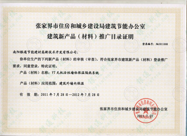 張家界市住房和城鄉(xiāng)建設(shè)局建筑節(jié)能辦公室建筑新產(chǎn)品(材料)推廣目錄證明 登錄編號:No.2011008 南陽銀通節(jié)能建材高新技術(shù)開發(fā)有限公司:你單位生產(chǎn)的下列新產(chǎn)品(材料)經(jīng)審核(審查),符合張家界市建筑新產(chǎn)品(材料)登錄推廣要求,同意登錄,特此證 明。 產(chǎn)品(材料)名稱:YT無機(jī)活性墻體保溫隔熱系統(tǒng) 產(chǎn)品(材料)應(yīng)用范圍:建筑外墻內(nèi)保溫 有效期:2011年7月28日——2012年7月28日 張家界市住房和城鄉(xiāng)建設(shè)局節(jié)能辦公室 2011.7.27