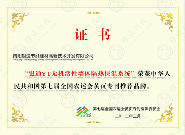 證書 南陽銀通節(jié)能建材高新技術(shù)開發(fā)有限公司 “銀通YT無機(jī)活性墻體隔熱保溫系統(tǒng)”榮獲中華人民共和國第七屆全國農(nóng)運(yùn)會黃頁?扑]品牌。 第七屆全國農(nóng)運(yùn)會黃頁?庉嬑瘑T會 二零一二年三月