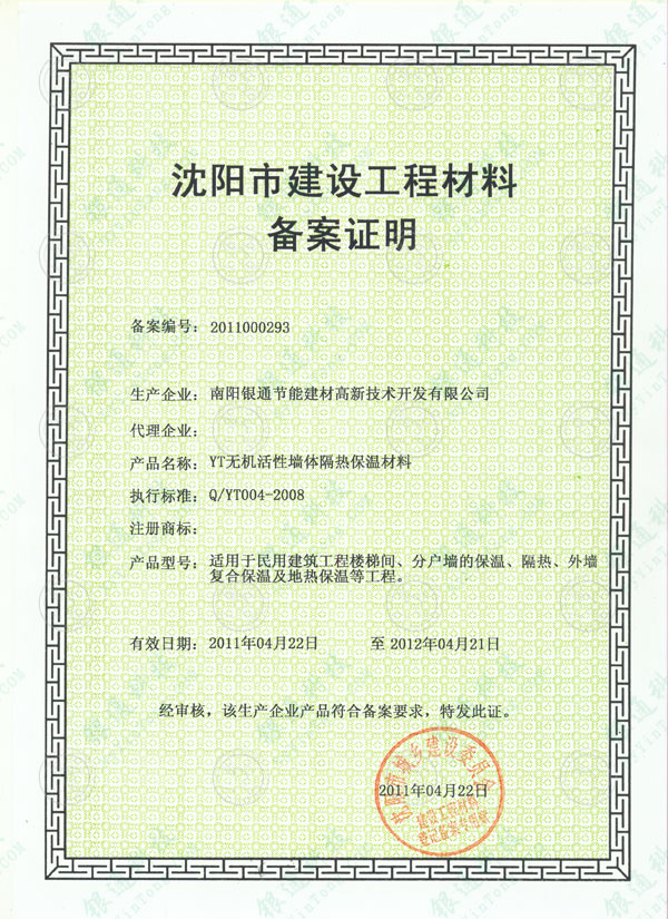沈陽(yáng)市建設(shè)工程材料備案證明 備案編號(hào):2011000293 生產(chǎn)企業(yè):南陽(yáng)銀通節(jié)能建材高新技術(shù)開(kāi)發(fā)有限公司 產(chǎn)品名稱(chēng):YT無(wú)機(jī)活性墻體隔熱保溫材料 執(zhí)行標(biāo)準(zhǔn):Q/YT004-2008 產(chǎn)品型號(hào):適用于民用建筑工程樓梯間、分戶(hù)墻的保溫、隔熱、外墻復(fù)合保溫及地?zé)岜氐裙こ獭?nbsp; 有效日期:2011年04月22日 至2012年04月21日 經(jīng)審核,該生產(chǎn)企業(yè)產(chǎn)品符合備案要求,特發(fā)此證。 沈陽(yáng)市城鄉(xiāng)建設(shè)委員會(huì) 建設(shè)工程材料備案登記專(zhuān)用章 2011年04月22日