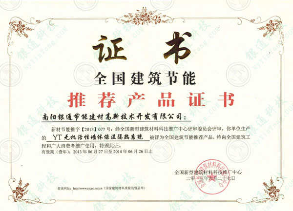 新材節(jié)能推字【2013】077號(hào):經(jīng)全國(guó)新型建筑材料科技推廣中心評(píng)審委員會(huì)評(píng)審,你單位生產(chǎn)的YT無(wú)機(jī)活性墻體保溫隔熱系統(tǒng)被評(píng)為全國(guó)建筑節(jié)能推薦產(chǎn)品,特向全國(guó)建筑工程和廣大消費(fèi)推廣使用,特頒此證。