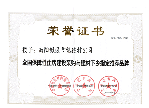 2011年7月17-18日在釣魚臺國賓館、天壇飯店召開“中國房地產50人論壇2011北京夏季峰會——產業(yè)轉型與融資戰(zhàn)略高層研討會”上,中國建筑材料流通協(xié)會,中國聯(lián)合商報社和北京房地產學會聯(lián)合發(fā)布,授予南陽銀通節(jié)能建材公司全國保障性住房建設采購與建材下鄉(xiāng)指定推薦品牌!