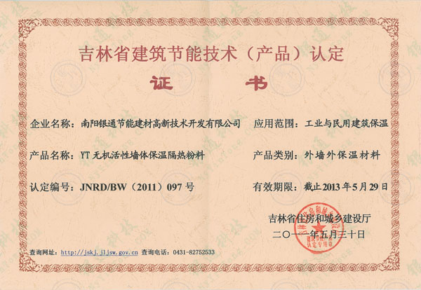 此證書為歷年曾獲證書,本介紹頁僅為方便用戶了解查詢企業(yè)歷史資質,望悉知 吉林省建筑節(jié)能技術產(chǎn)品認定 有效期限:截至2013年5月29日