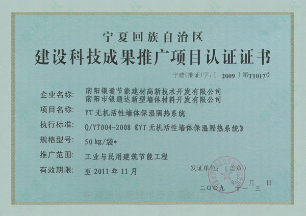 寧夏回族自治區(qū) 建設(shè)科技成果推廣項目認(rèn)證證書 有效期至2011年11月