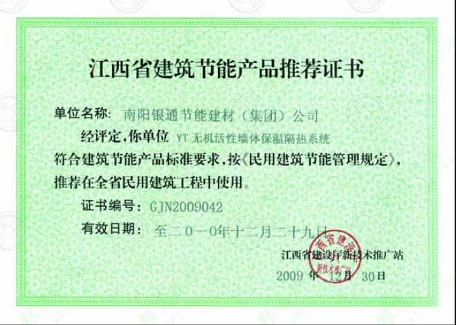 【曾獲】 江西省建筑節(jié)能產(chǎn)品核準證書 證書有效期至:2010年12月29日