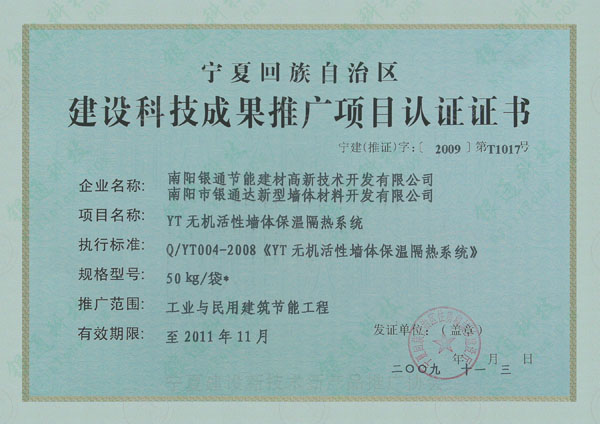 寧夏回族自治區(qū)建筑節(jié)能產(chǎn)品核準(zhǔn)證書