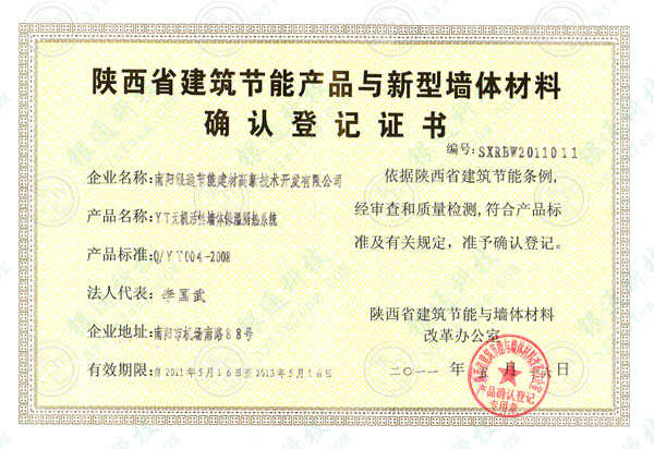 陜西省建筑節(jié)能產(chǎn)品與新型墻體材料確認登記證書 有效期限 :2011年5月16日至2013年5月16日