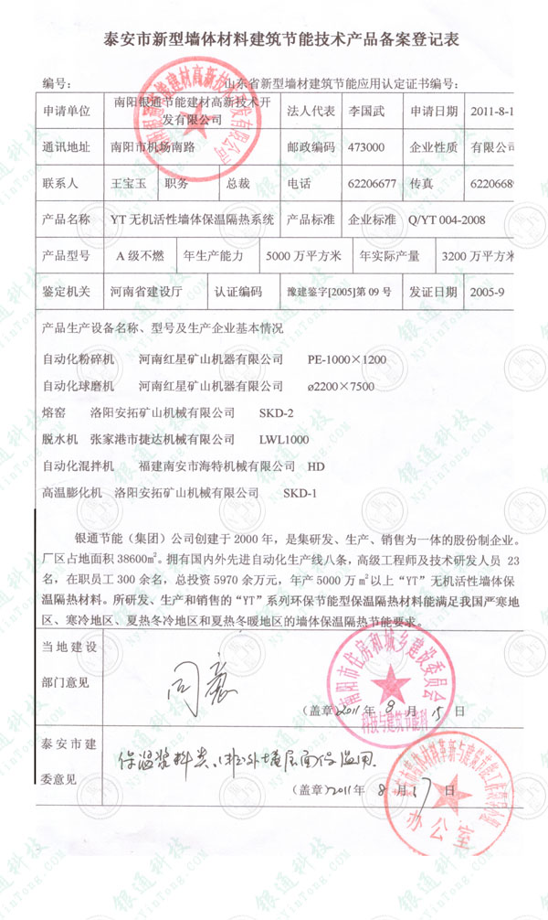 山東泰安市新型墻體材料建筑節(jié)能技術(shù)產(chǎn)品備案登記證 山東省新型墻材建筑節(jié)能應(yīng)用認(rèn)定證書 南陽銀通節(jié)能建材高新技術(shù)開發(fā)有限公司 你單位生產(chǎn)的yt無機(jī)活性墻體保溫隔熱系統(tǒng) 已經(jīng)取得山東省新型墻材建筑節(jié)能技術(shù)產(chǎn)品認(rèn)定證書 同意在我市建設(shè)工程保溫漿料中應(yīng)用 當(dāng)?shù)亟ㄔO(shè)部門意見 南陽市住房和城鄉(xiāng)建設(shè)委員會科技與建筑節(jié)能科 同意推廣應(yīng)用 泰安市建委意見 保溫漿料類 外墻屋面保溫用 泰安市墻體材料革新與建筑節(jié)能工作領(lǐng)導(dǎo)小組辦公室 2011年8月17日