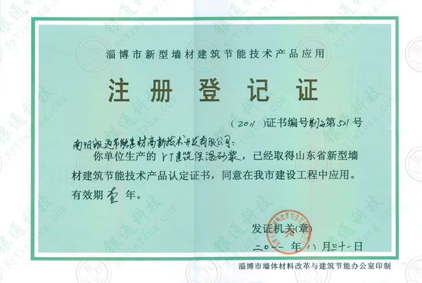 山東淄博市新型墻體建筑節(jié)能技術產(chǎn)品應用注冊登記證2011證書編號第521號 南陽銀通節(jié)能建材高新技術開發(fā)有限公司 你單位生產(chǎn)的yt建筑保溫砂漿 已經(jīng)取得山東省新型墻材建筑節(jié)能技術產(chǎn)品認定證書 同意在我市建設工程中應用 有效期壹年 發(fā)證機關 淄博市墻體材料改革與建筑節(jié)能辦公室 二零零一八月三十一日
