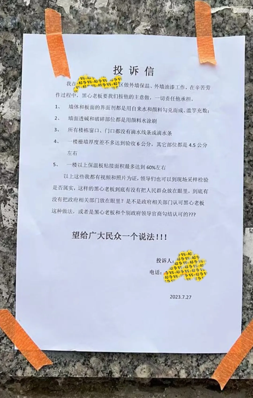 具體怎么干?來放一張前不久網(wǎng)上流傳的,一名外墻保溫工人的自曝投訴信,大家可以舉一反三: