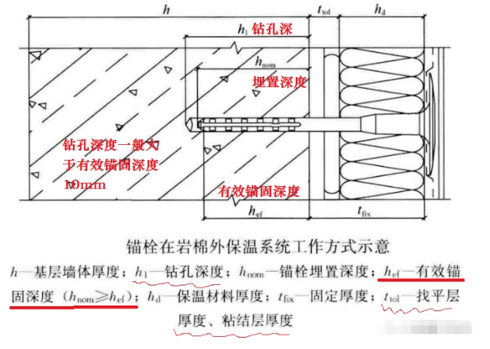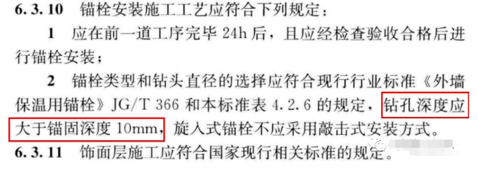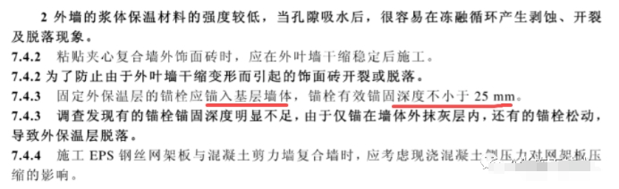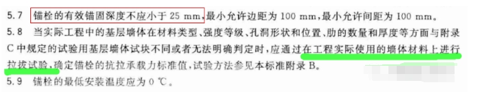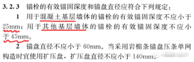 混凝土基層墻體的錨栓有效錨固深度不應(yīng)小于25mm,其他基層墻體的錨栓有效錨固深度不應(yīng)小于45mm;