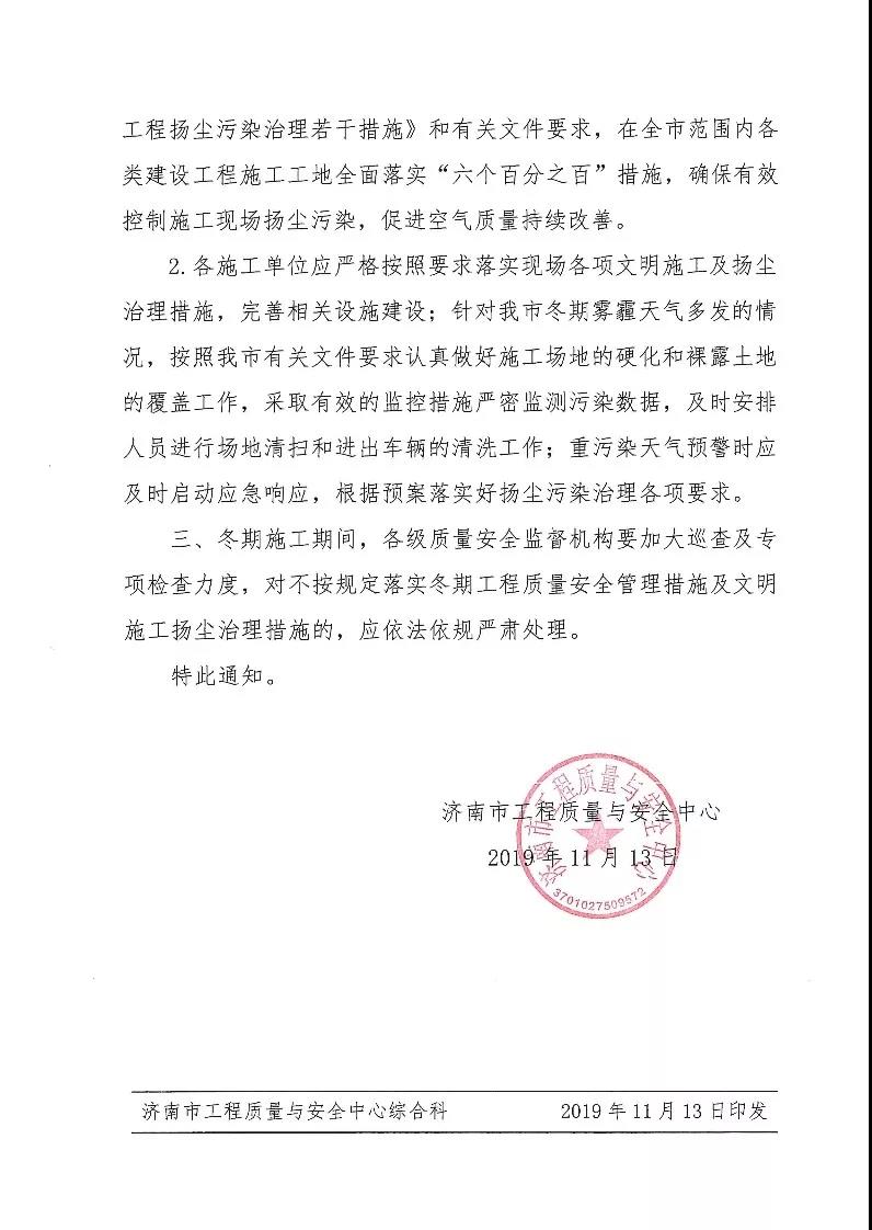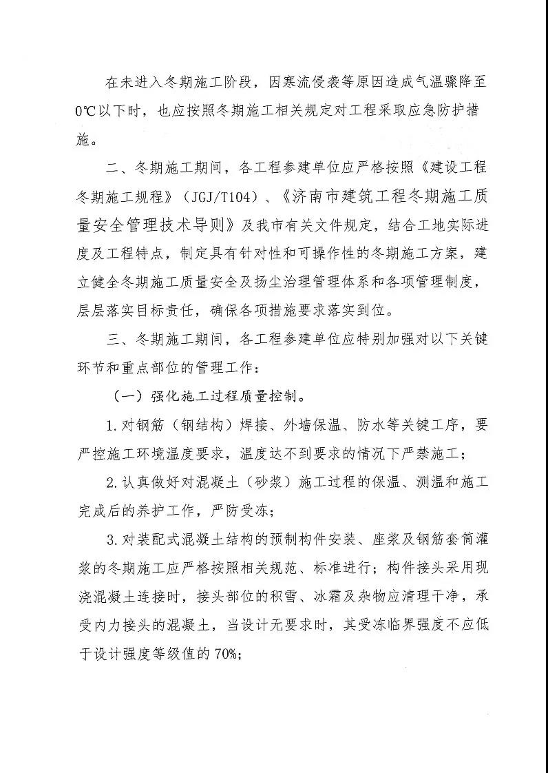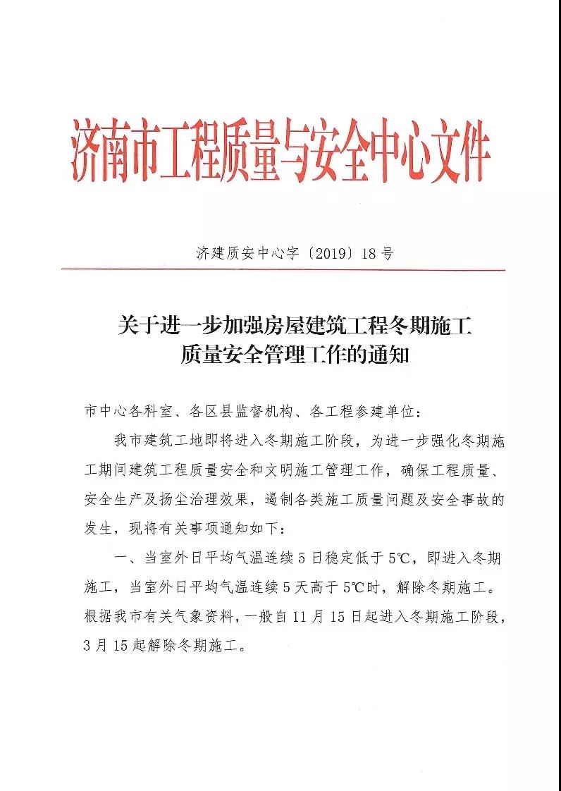 11月13日,濟(jì)南市工程質(zhì)量與安全中心發(fā)布了《關(guān)于進(jìn)步一加強(qiáng)房屋建筑工程冬期施工質(zhì)量安全管理工作的通知》,對(duì)冬季外墻保溫施工、防水等提出了要求,具體通知如下: