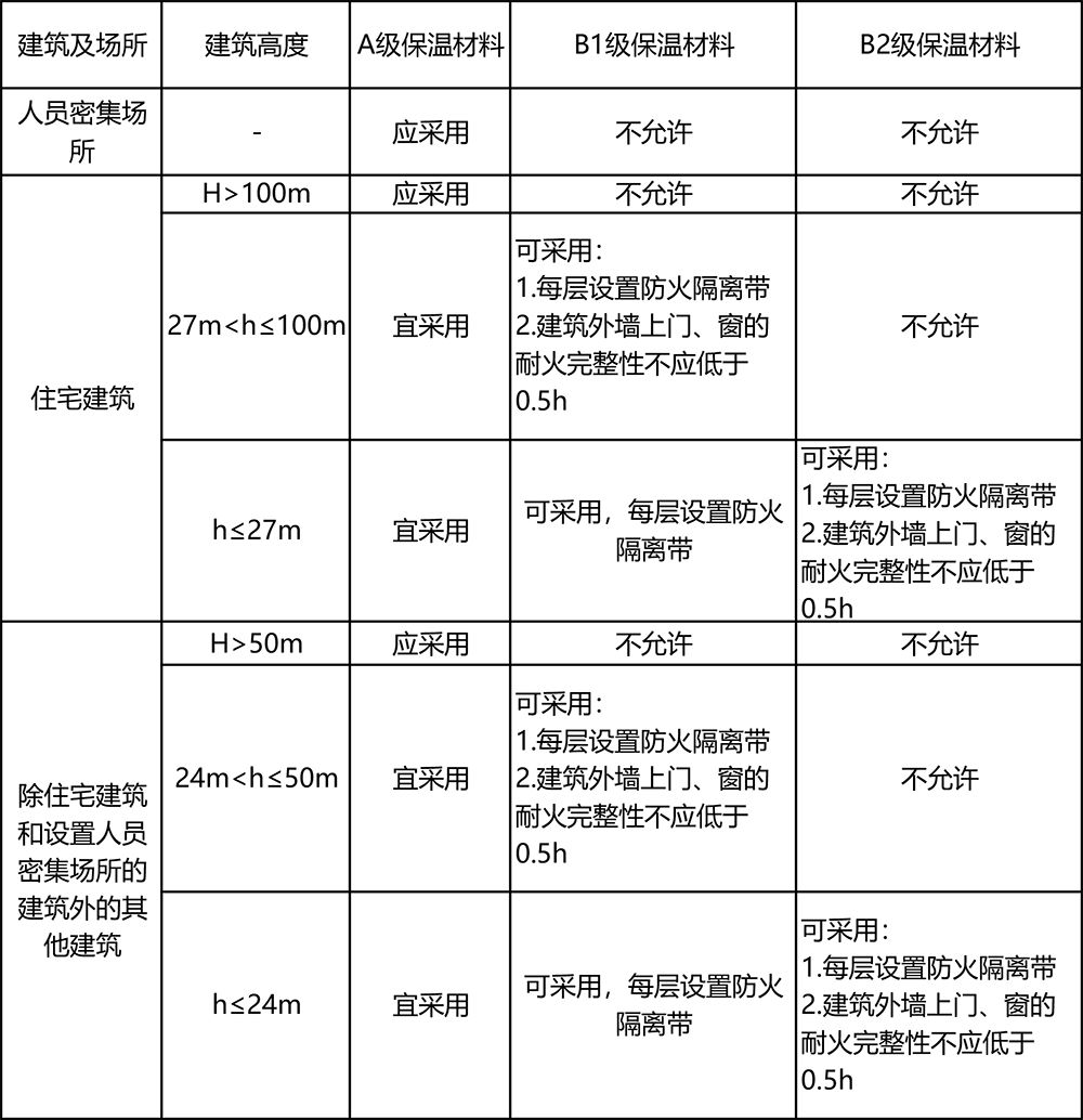 《建筑防火通用規(guī)范》與《建筑設(shè)計(jì)防火規(guī)范》都規(guī)定了外墻保溫材料宜采用A級(jí)不燃燒材料。目前的建筑外墻保溫材料防火等級(jí)主要有四級(jí),宜采用A級(jí)不燃材料、不宜采用B2級(jí)可燃材料、嚴(yán)禁采用B3級(jí)易燃材料。
