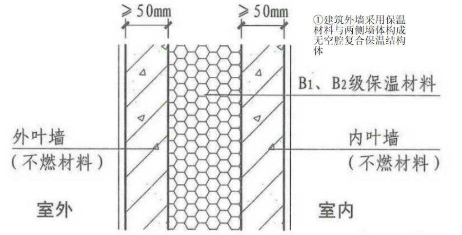 ①是最特殊的,現(xiàn)在應(yīng)用較少的一種情況,保溫材料夾在墻體中間,墻體既有支撐作用又有防護(hù)作用要求墻體厚度不小于50mm。采用B1、B2級材料時用A級材料在樓板處進(jìn)行隔離,高度不小于300mm,防止下一層著火,延保溫層豎向蔓延。就想前面提到的火災(zāi)一樣。