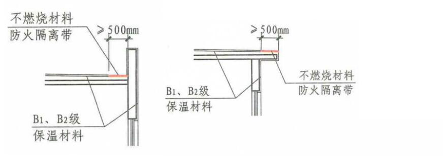 由于屋面保溫材料的火災(zāi)危害較建筑外墻的要小,且當(dāng)保溫層覆蓋在具有較高耐火極限的屋面板上,對建筑內(nèi)部的影響不大,故對其保溫材料的燃燒性能要求較外墻的要求要低些。但為限制火勢通過外墻向上蔓延,要求屋面與建筑外墻的交接部位應(yīng)做好防火隔離處理。當(dāng)屋面板耐火極限較高不低于1.00h,保溫層耐火等級選擇不低于B2級,屋面板耐火等級低于1.00h,保溫層耐火極限要選擇相對較高的不低于B1級。防護(hù)層和內(nèi)保溫一樣厚度不小于10mm。