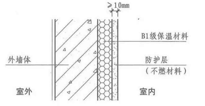 建筑內(nèi)保溫人密(人多,發(fā)生火災(zāi)不利于疏散),用火油氣(火災(zāi)危險性大的場所),疏散通道(著火了要從這些地方跑或避難)采用A級;其他B1級并且因為是室內(nèi)如果產(chǎn)生有毒煙氣會造成人員傷亡要求低煙低毒。下圖為內(nèi)保溫采用B1級材料時,防護(hù)層設(shè)置示意圖。