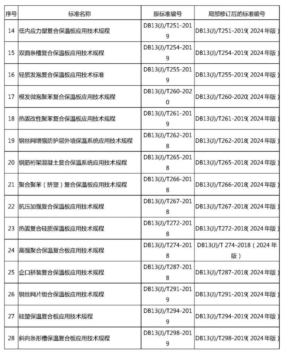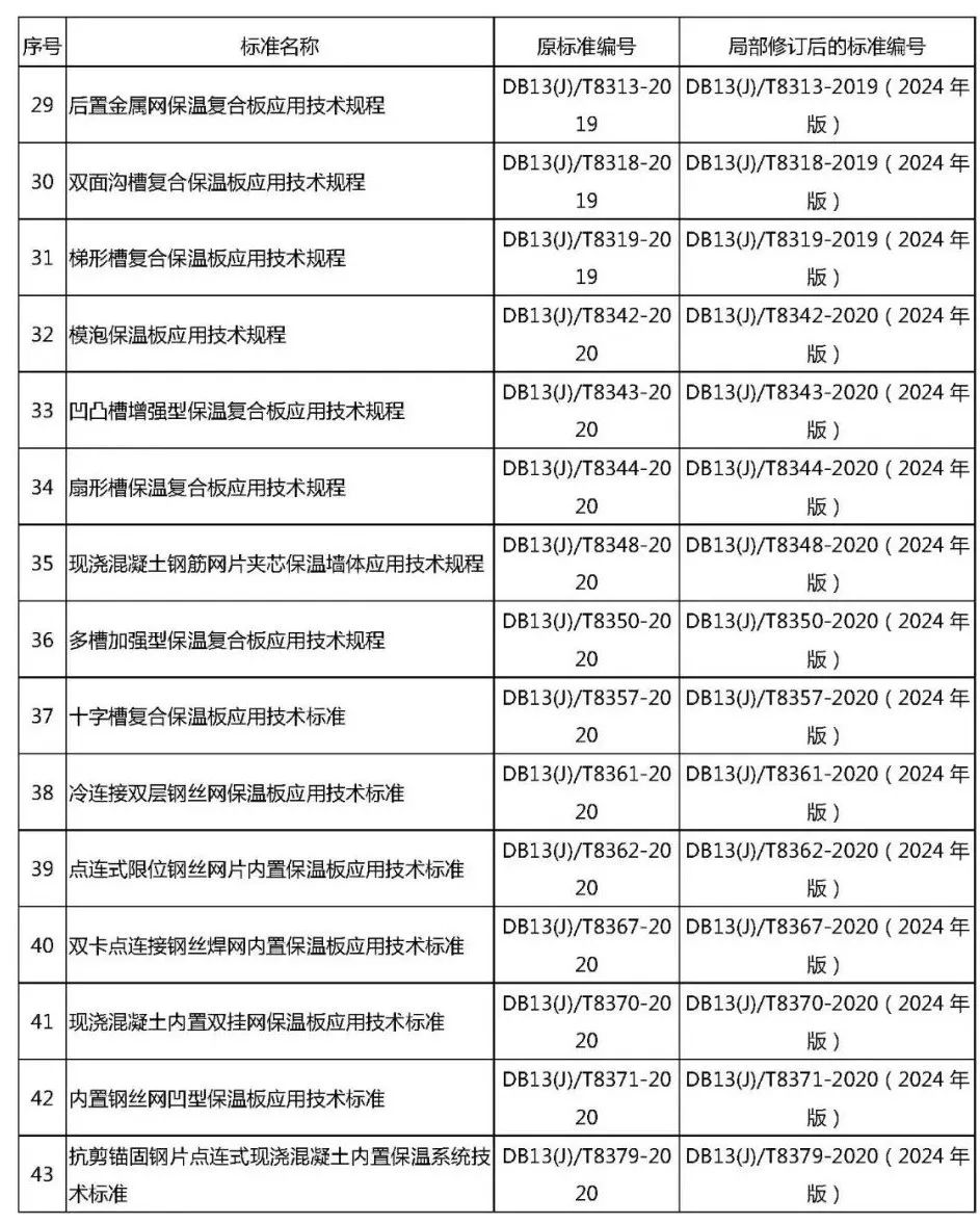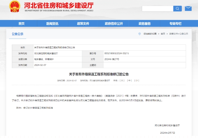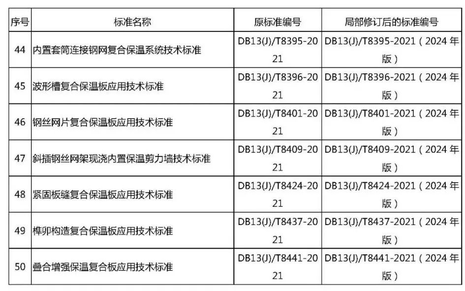 根據(jù)現(xiàn)行國家強制性工程建設規(guī)范和《河北省民用建筑外墻外保溫工程統(tǒng)一技術(shù)措施》(冀建質(zhì)安〔2021〕4號)的要求,對50項外墻保溫工程系列標準(見附件)進行了修訂。本次修訂的外墻保溫工程系列標準已經(jīng)本機關(guān)審查并批準為河北省工程建設地方標準,現(xiàn)予發(fā)布,自2024年5月1日起實施,原標準同時廢止。