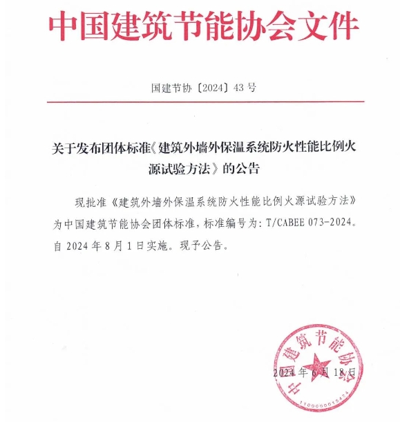 2024年6月18日,中國建筑節(jié)能協(xié)會發(fā)布團(tuán)體標(biāo)準(zhǔn)《建筑外墻外保溫系統(tǒng)防火性能比例火源試驗方法》的公告。標(biāo)準(zhǔn)編號為:T/CABEE 073-2024。自2024年8月1日實施。